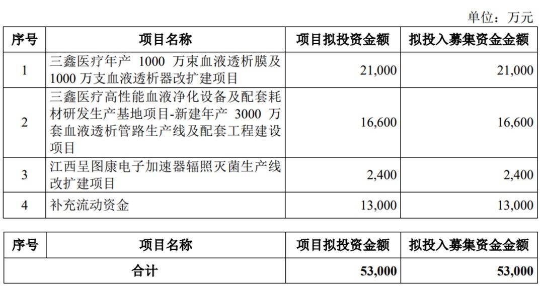 本次扣除发行费用后的募集资金净额将用于三鑫医疗年产1000万束血液透析膜及1000万支血液透析器改扩建项目、三鑫医疗高性能血液净化设备及配套耗材研发生产基地项目-新建年产3000万套血液透析管路生产线及配套工程建设项目、江西呈图康电子加速器辐照灭菌生产线改扩建项目、补充流动资金。