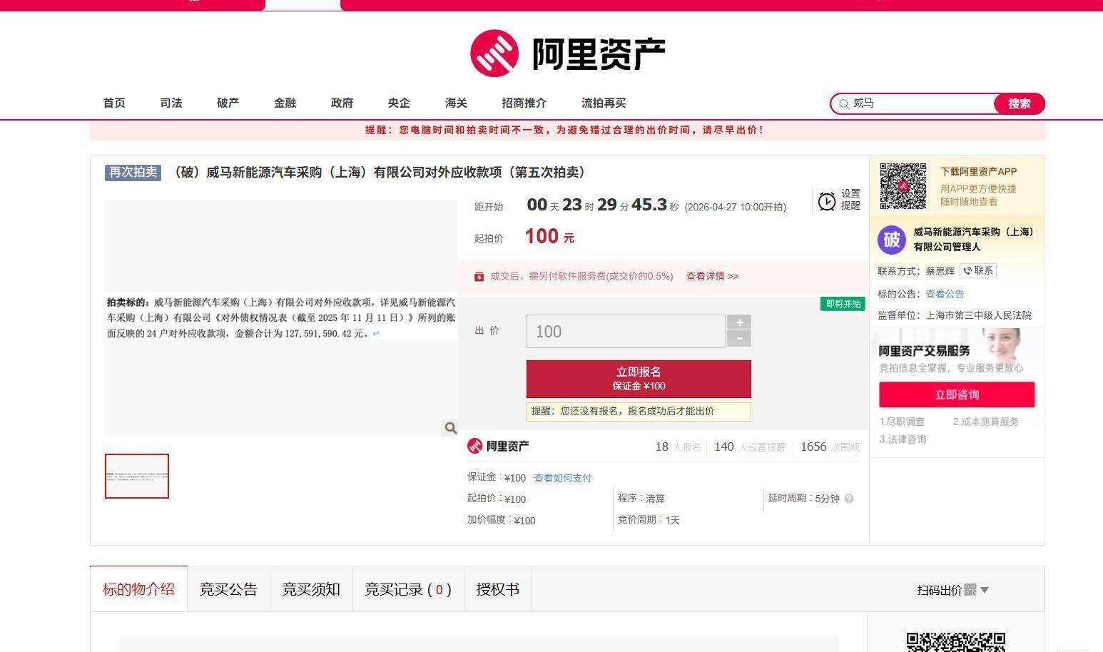 据淘宝阿里拍卖平台,威马新能源汽车采购(上海)有限公司管理人将于4月27日对威马新能源汽车采购(上海)有限公司对外应收款项进行拍卖,拍卖标的为账面反映的24户对外应收款项,金额合计为1.275亿元,起拍金额为100元。