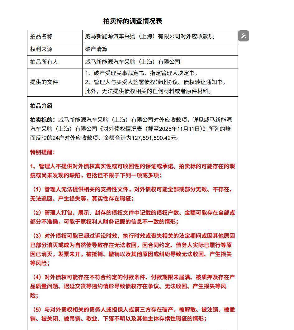 据拍卖标的调查情况表显示,威马新能源汽车采购(上海)有限公司对外应收款项24户对外应收款项,金额合计为127,591,590.42元。可以提供破产受理民事裁定书、指定管理人决定书,管理人与买受人签署债权转让协议、债权转让通知书,但无法提供与债权相关的任何材料或者原件材料。
